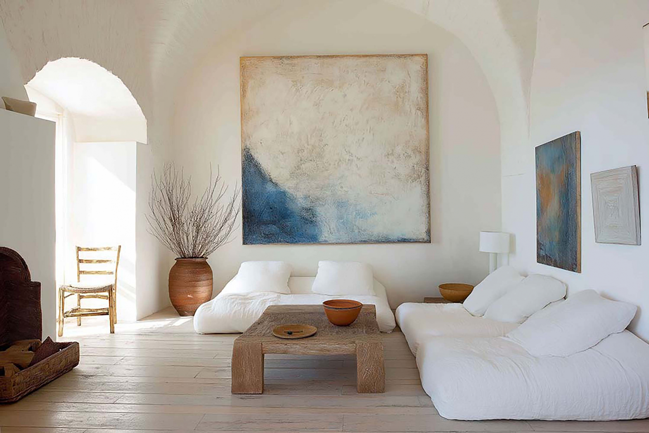 This is an interior wall art mockup with PSD template to easily substitute your own artwork. The room is a calm or relaxed modern interior with low sofas.
