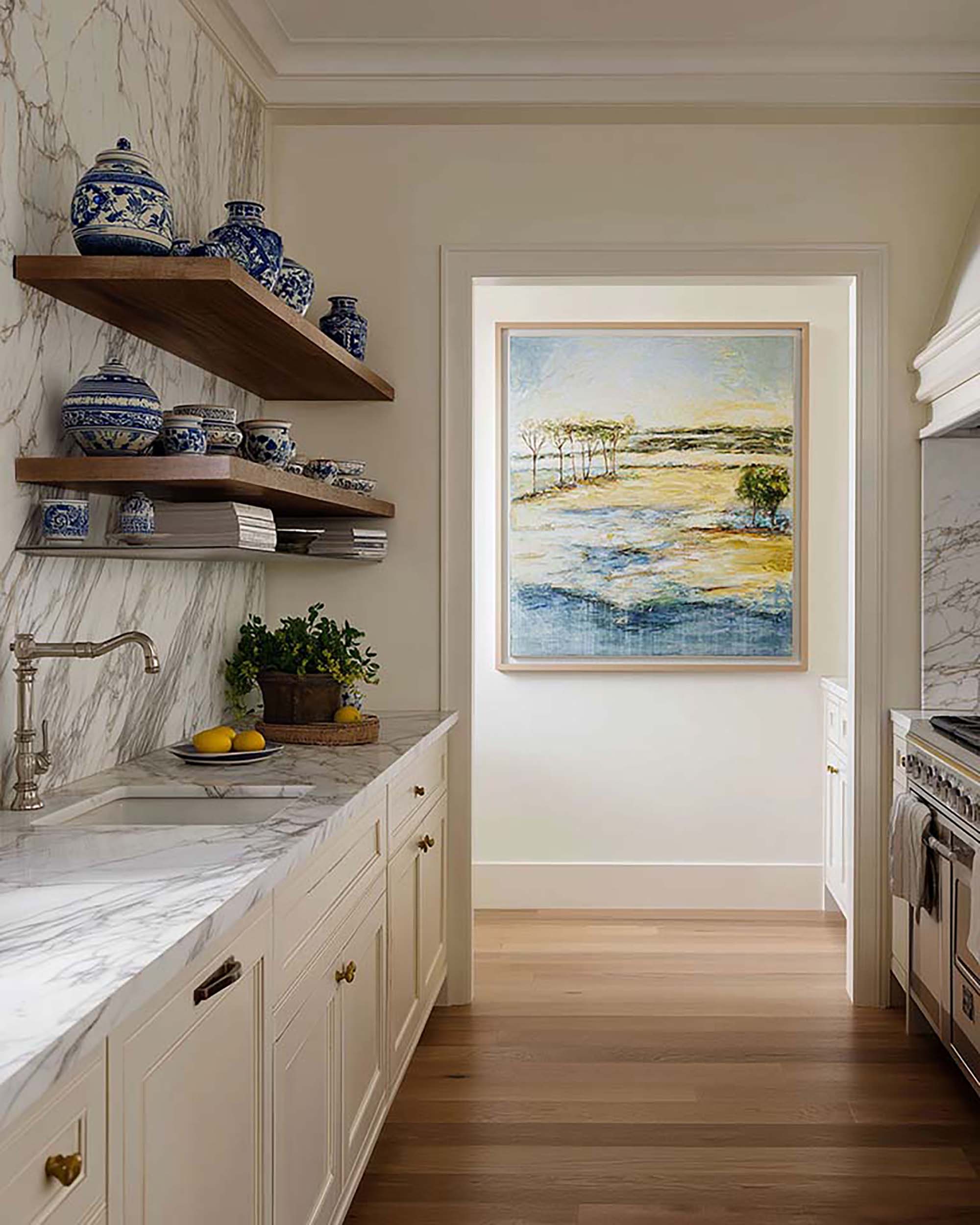 This is an interior wall art mockup with PSD template to easily substitute your own artwork. The room features a kitchen with marble countertop and view into a hallway.