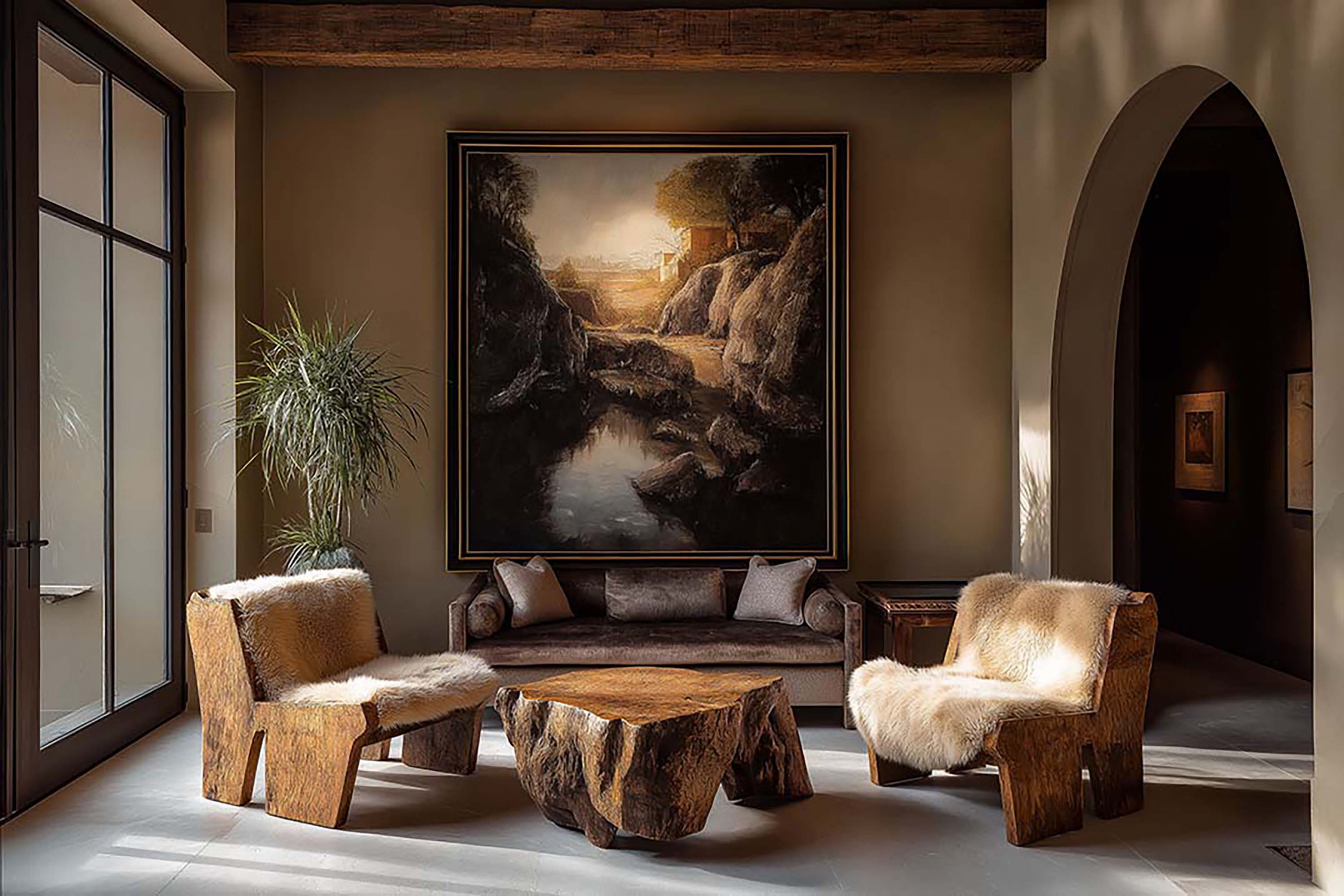 This is an interior wall art mockup with PSD template to easily substitute your own artwork. The room features a dark palette with ultra modern wooden furniture.